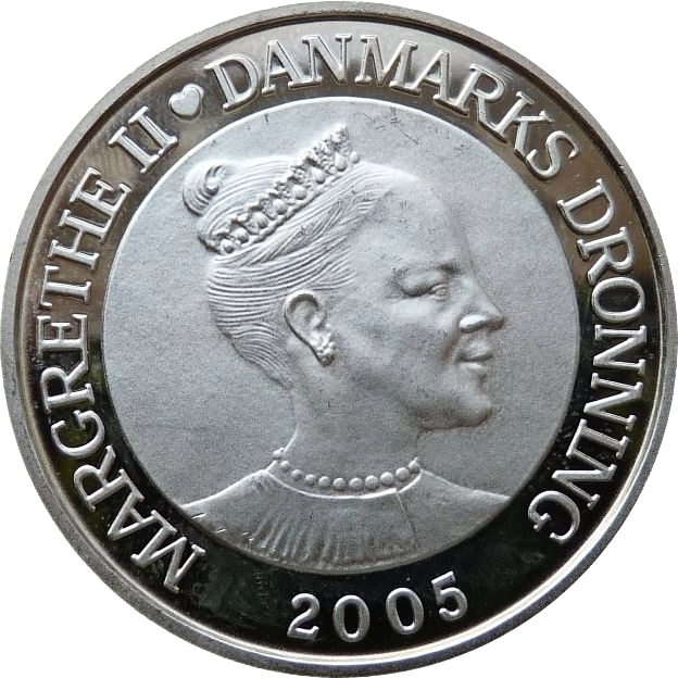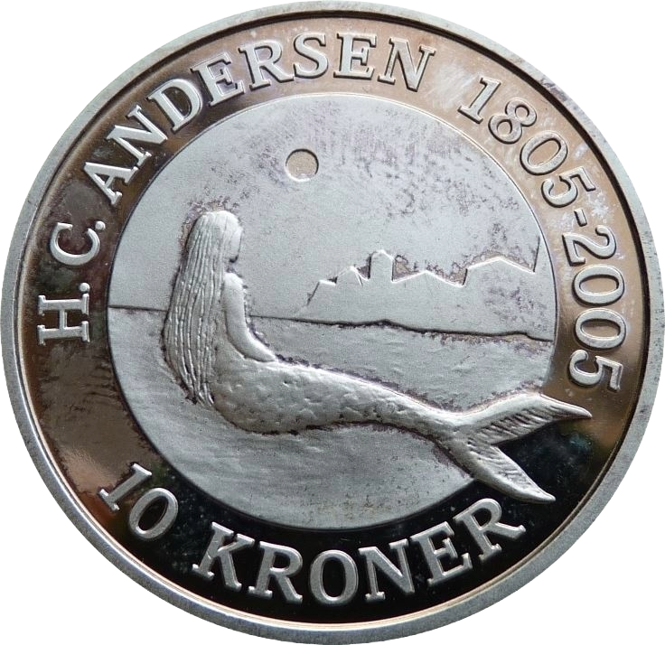 Sølvmønt i H.C. Andersen møntserien. Sølvmønten er lavet i anledning af H.C. Andersen 200 års fødselsdag i 2005. Mønten er præget med en motiv inspireret af eventyret Den Lille Havfrue.