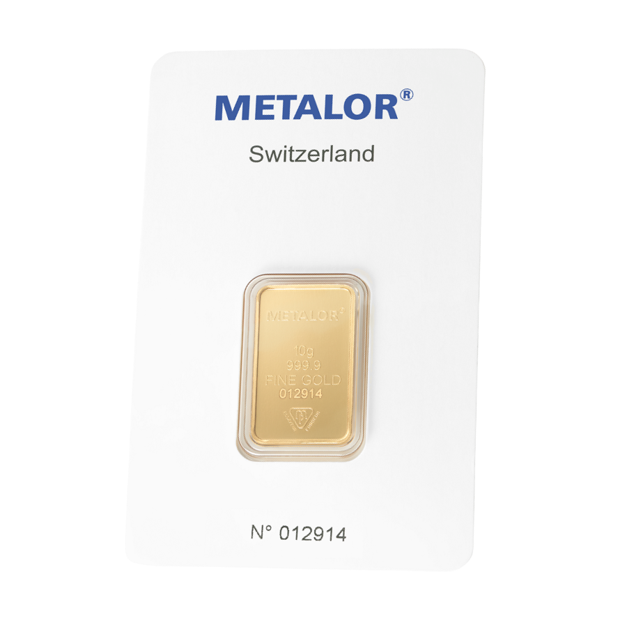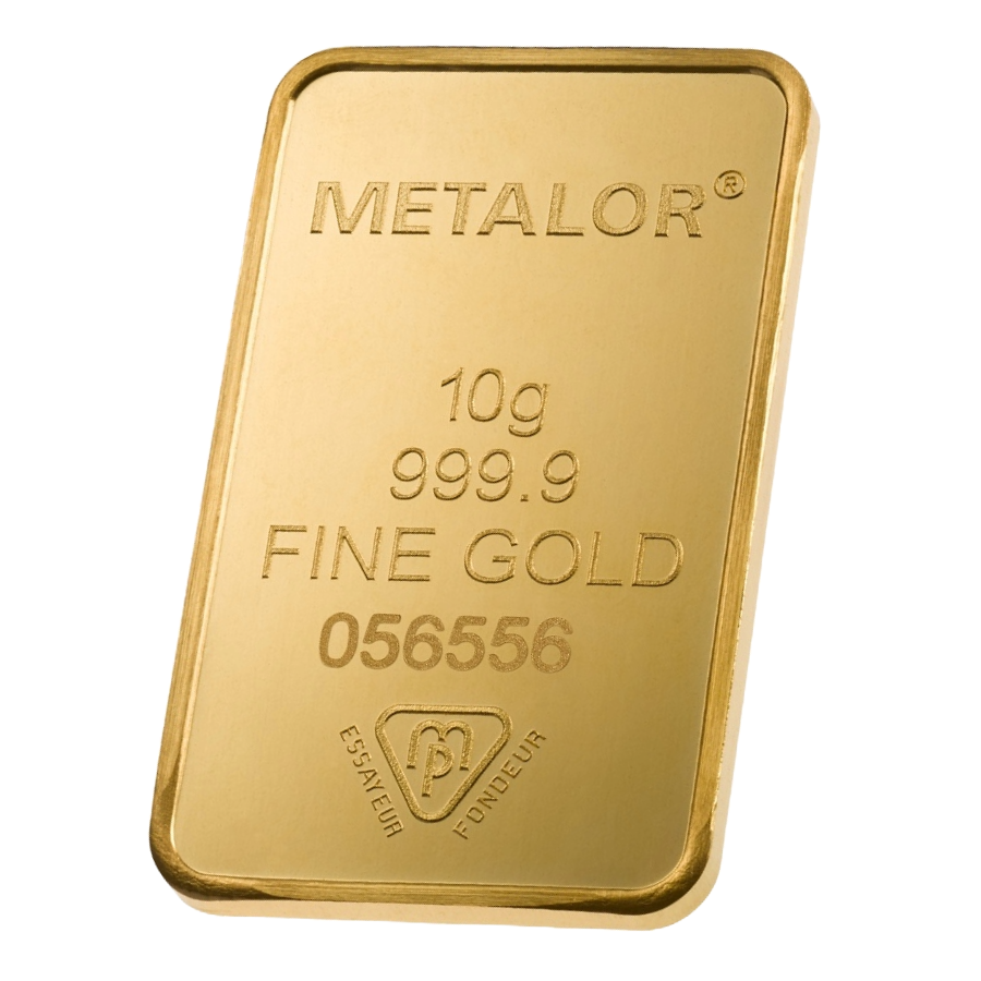 Flot udstanset Metalor guldbarre på 10 g. i 24 karats guld.