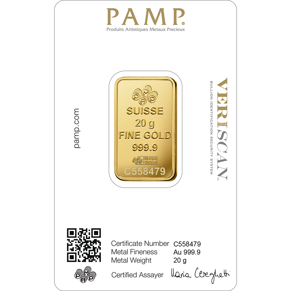 Flot udstanset guldbarre på 20 g. i 24 karats guld.