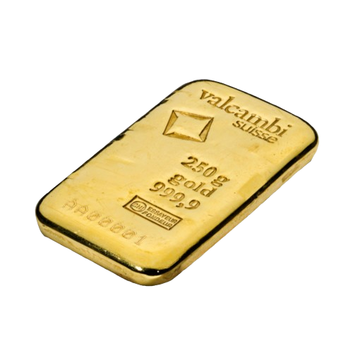 Lækker støbt Valcambi guldbarre på 250 g. i 24 karats guld.